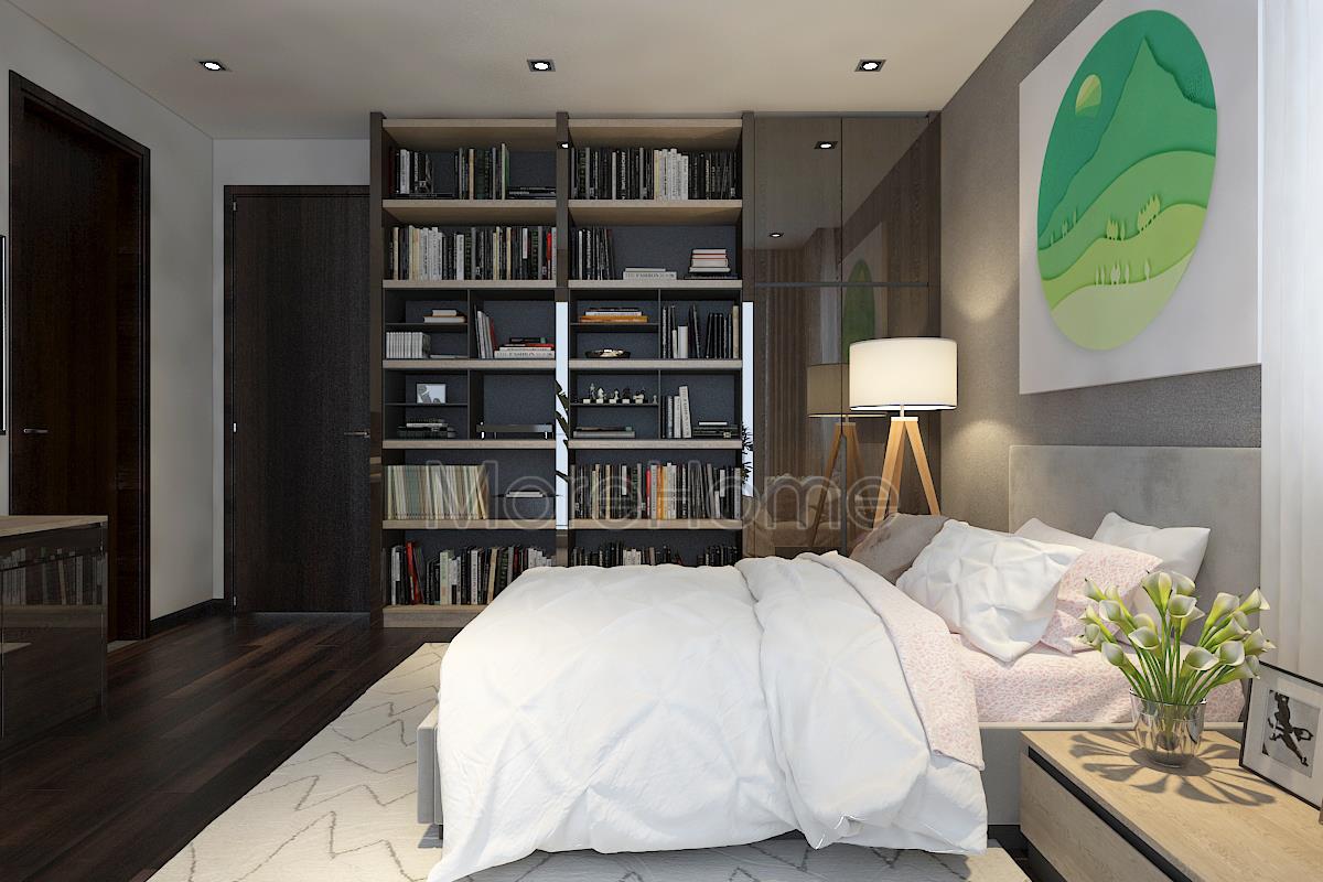 Phòng ngủ được thiết kế hoàn toàn ở trên tầng, những không gian phòng ngủ với đồ nội thất cùng tông màu với không gian tầng 1. Nội thất phòng ngủ được thiết kế khá đơn giản với chiếc giường hình chữ nhật, đối diện là vách ngăn gỗ kính tạo không gian riêng tư cho phòng ngủ với phòng tắm. bên trong phòng ngủ được thiết kế một không gian phòng nhỏ để gia chủ đọc sách hay làm việc.