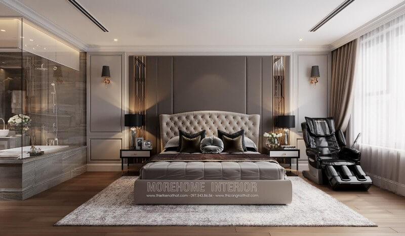 Nội thất phòng ngủ ấn tượng với gam màu xám chủ đạo với cách phân chia và bố trí hợp lí, tạo sự sang trọng và tiện nghi nhất cho gia chủ