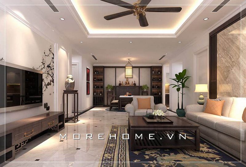 Tạo ra một thiết kế nội thất phòng khách hiện đại với một bàn thờ đẹp, sang trọng cho căn hộ chung cư.