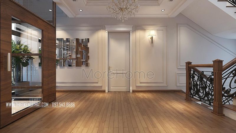 Khu vực bếp tân cổ điển được lắp đặt với cửa ra vào quay lưng để đảm bảo luồng khí phong thủy đi theo hướng đúng, mang lại nhiều may mắn và tài lộc cho chủ nhà.