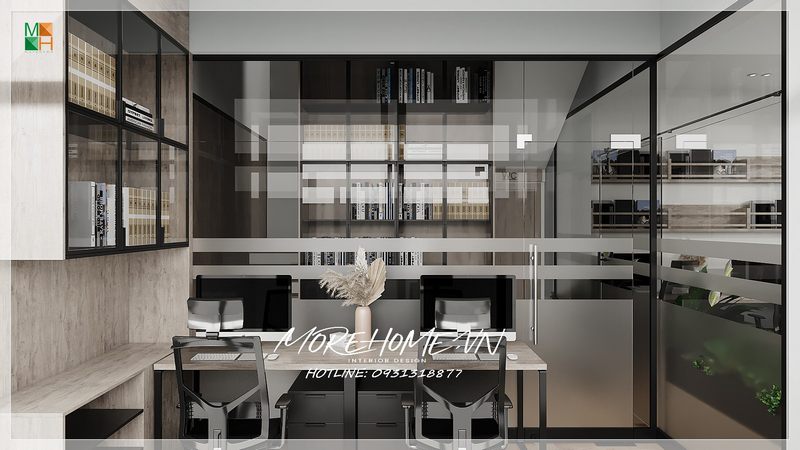 Văn phòng được trang trí đẹp bằng gỗ công nghiệp MFC cao cấp, bao gồm các thiết bị như bàn ghế, kệ sách, ốp sàn,..