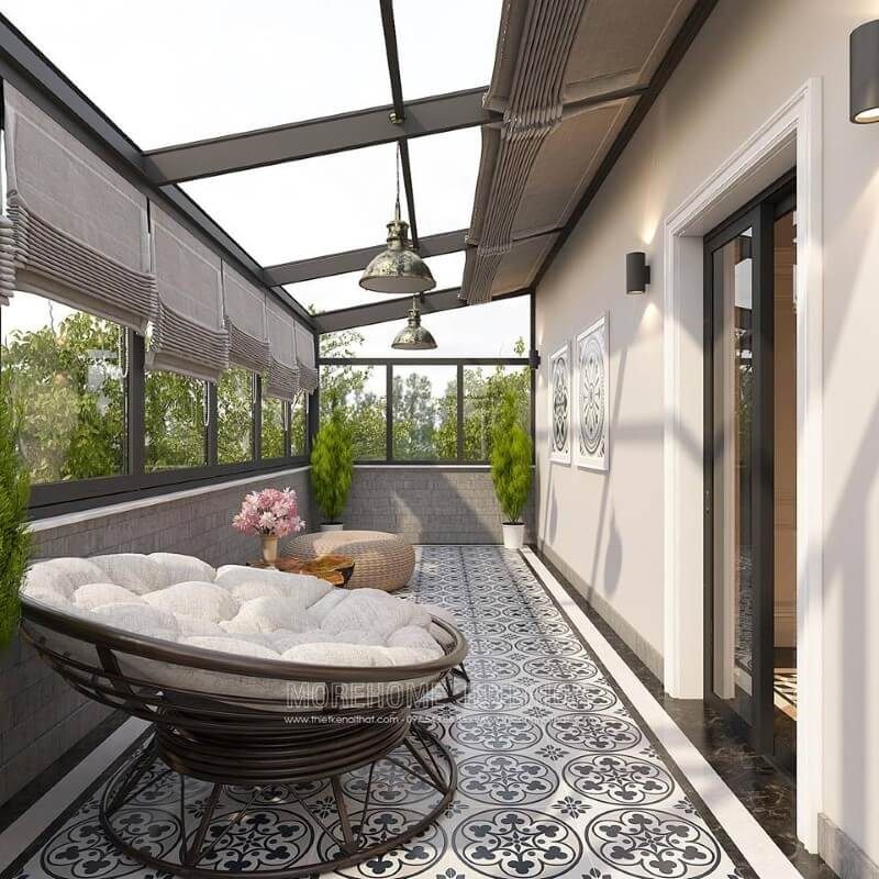 Ban công đẹp và độc đáo với hệ cửa kín được thiết kế bằng kính cường lực cao cấp và rèm chắn, giúp không gian luôn thông thoáng nhưng cũng có thể chắn đựng gió và ánh sáng khi cần thiết.