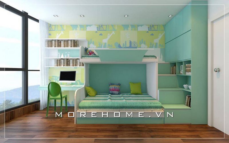 . Giường tầng hiện đại cùng với tủ kệ tiện dụng là sự lựa chọn tuyệt vời cho không gian phòng ngủ trẻ em. Bàn học được bố trí gần giường tạo nên một không gian trọn vẹn.